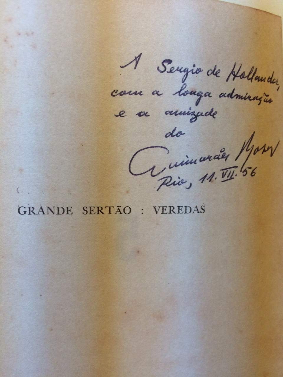 A edição da Cia. das Letras é boa. Autor de sucesso merece capricho, né? E os documentos que Chico publicou em alguns capítulos mostram a dificuldade que seu pai teve para conseguir notícias do filho alemão. Primeiro, o nazismo. Depois, a Alemanha Oriental, fechada ao mundo capitalista. Sem informações, sem esperanças, com muitas dúvidas. Destaque para a dedicatória abaixo, de Guimarães Rosa, na primeira edição de Grande sertão: veredas endereçada a Sergio, marotamente tornado Hollander, como em todos os documentos do livro. Reais, mas ficcionais.