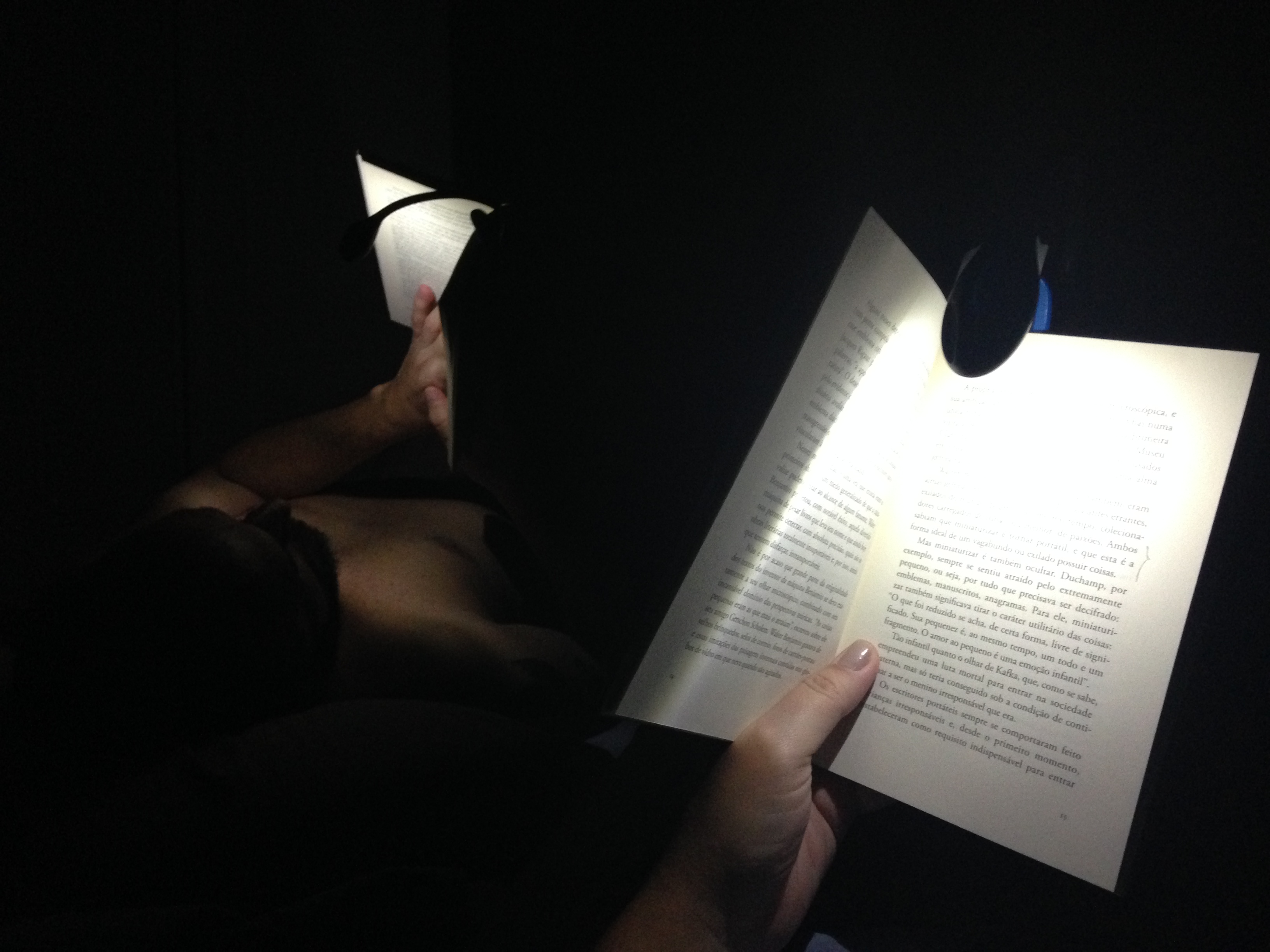Lanterninhas de leitura seriam a segunda melhor invenção da humanidade depois do queijo coalho, não fosse o Kindle. Mas, ranking à parte, as duas coisas têm a grande utilidade de permitir a leitura na cama, à noite, no escurinho do quarto. Funcionam muito melhor do que luminárias de cabeceira e garantem minutos preciosos de leitura antes do soninho. As nossas lanternas são Energizer e estão durando bastante. Só precisa trocar as pilhas de vez em quando. E o Kindle, se um dia for comprar um, que seja o Paperwhite, que tem a tela iluminada. Faça-se esse favor.