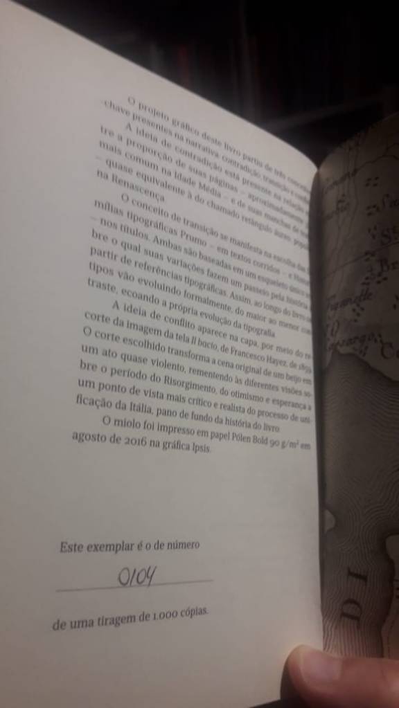 Pequeno mundo antigo foi uma leitura surpreendentemente boa, saborosa e fluída. E o romance faz parte da já grande coleção de “livros que comprei pela capa”, até porque nunca tinha ouvido falar dessa obra até me deparar com essa belíssima edição da Carambaia em uma prateleira da Livraria da Travessa de Pinheiros. Já está fazendo uma bela figura em nossa biblioteca, com essa capa linda, lombada sóbria e elegante e os mapas do lago de Lugano na guarda. A produção gráfica é de Tuut e a edição é numerada. Nosso exemplar é o 104 de uma belíssima tiragem de 1000 cópias. Belíssima para o padrão brasileiro, é claro.