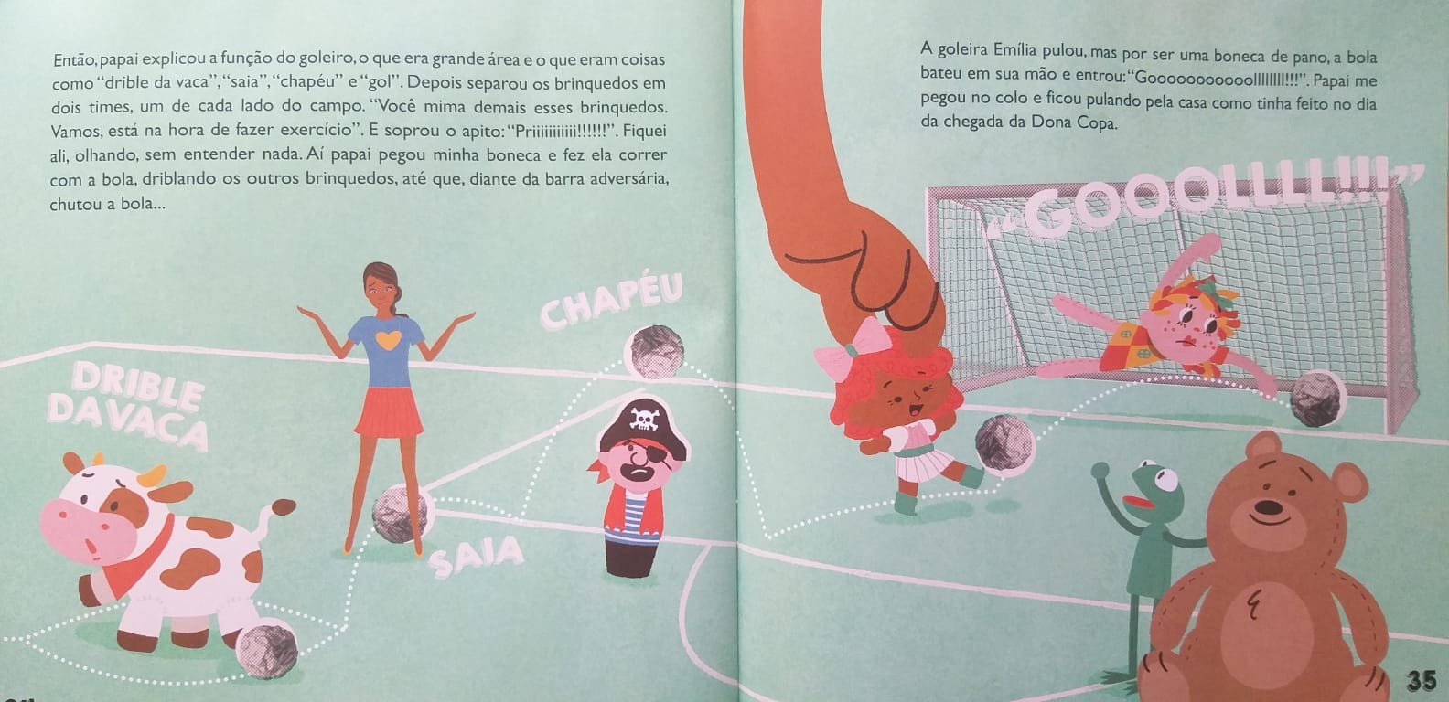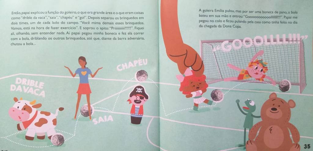 Mas, como sói acontecer, o natural é que essa paixão seja passada apenas para os filhos homens. Apesar do nome de jogadora, Martinha não é incluída nos preparativos para a Copa (o mesmo aconteceria se fosse um menino chamado Ronaldo?). O pai corre atrás do prejuízo, explica as regras do jogo para a menina em um campo desenhado a giz no chão, usando como jogadores as suas bonecas e bichinhos de pelúcia – num trecho ilustrado lindamente por Eduardo Padrão.