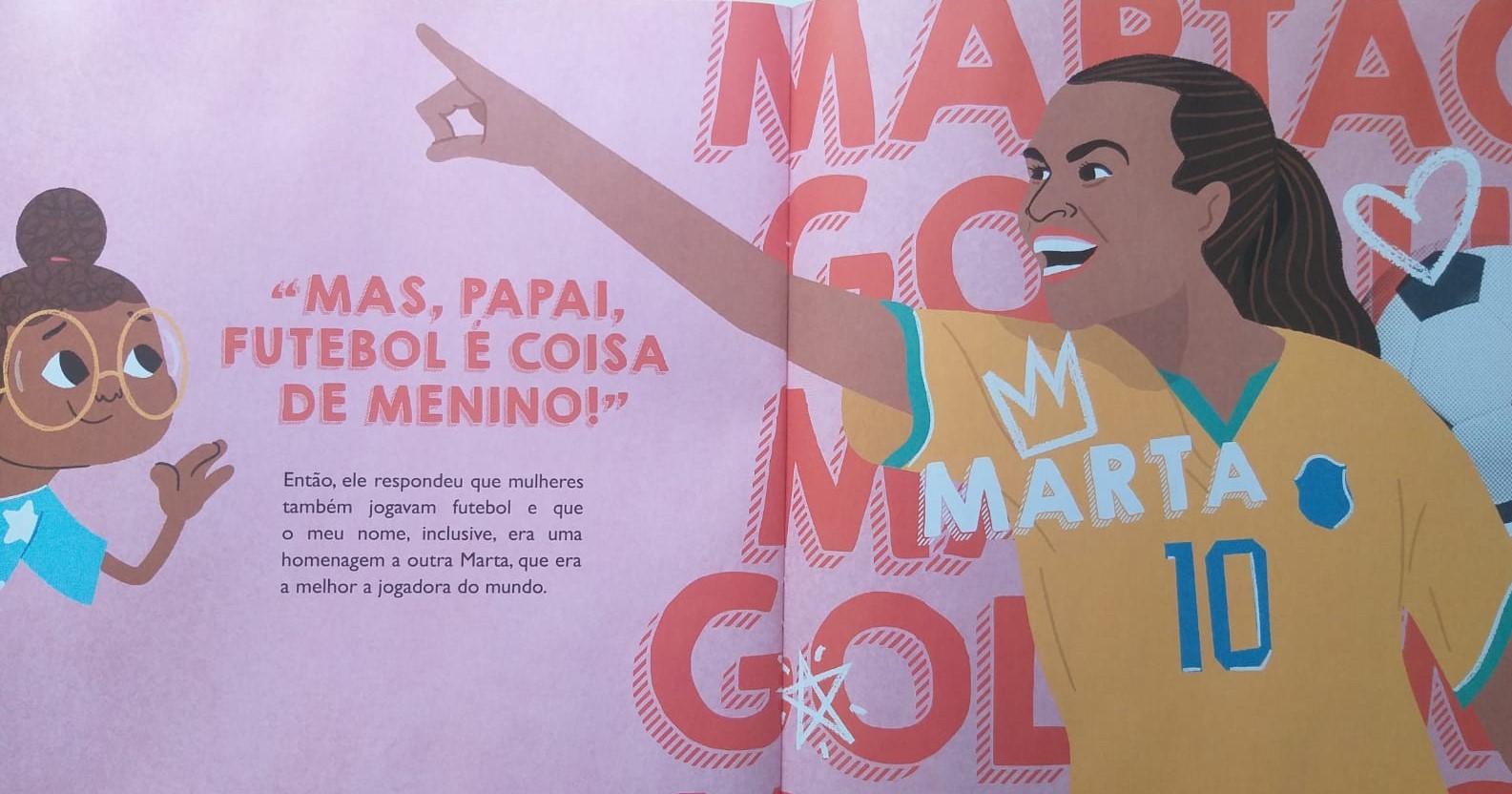 Ao se deparar com um álbum de figurinhas, Martinha chega à inevitável conclusão de que futebol é coisa de menino. É quando o pai conta que o nome dela é uma homenagem à maior jogadora de futebol brasileira. Aos poucos, o livro vai se revelando uma obra interessante pra falar sobre a relação das mulheres brasileiras com o futebol – relação que, assim como a dos meninos, é quase sempre construída em torno do envolvimento do pai com o esporte.