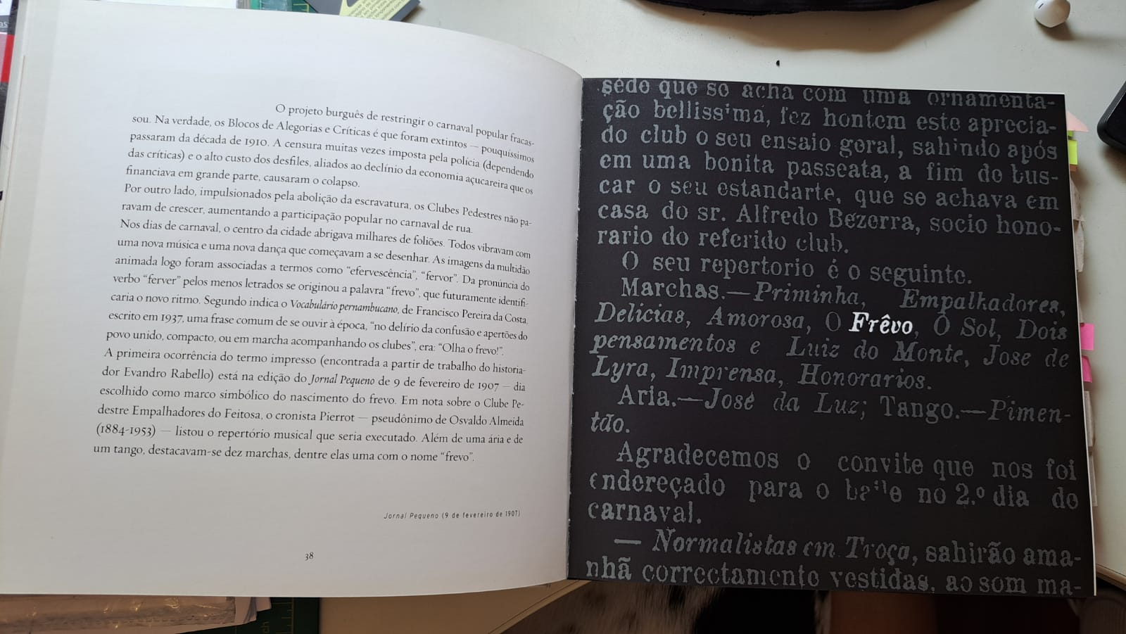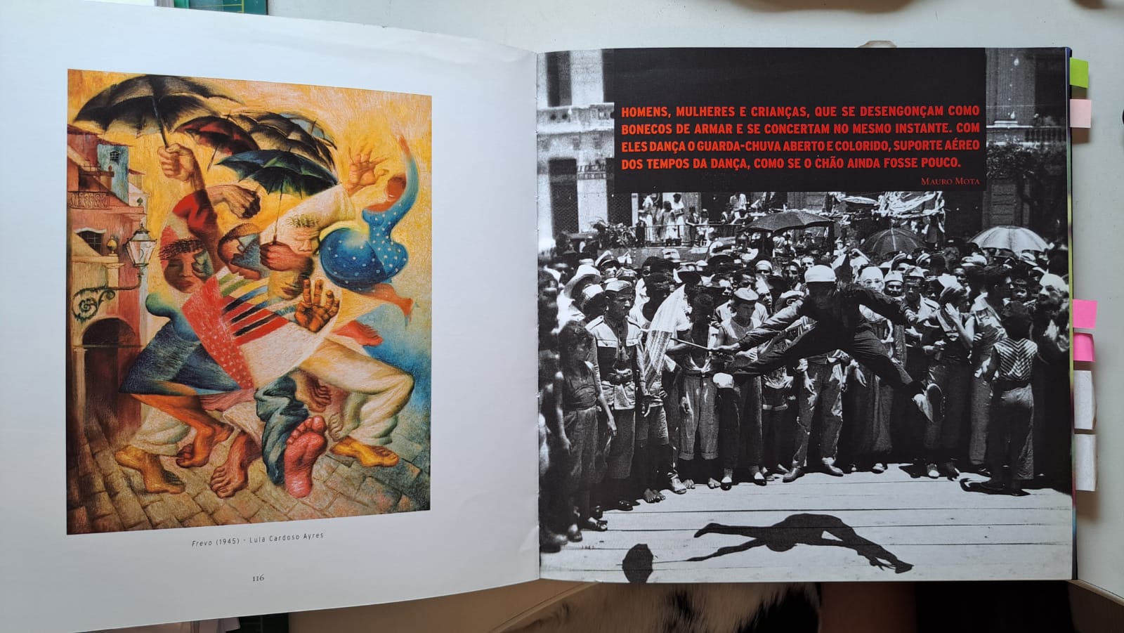 O livro tem textos de Camilo Cassoli e Luiz Augusto Falcão divididos em capítulos que abordam as origens, a música, a dança, a sombrinha e por aí vai. Mas o que o volume tem de mais legal é a inserção de trechos sobre o frevo escrito por escritoras e escritores brasileiros – principalmente ensaios e crônicas, mas também contos e trechos de romances. A lista inclui Mário de Andrade, Clarice Lispector, José Lins do Rêgo, Antônio Maria e outros.