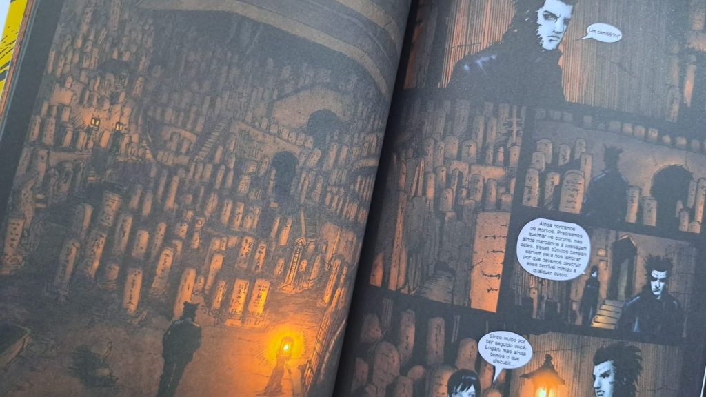 Além disso, o cenário é importante. Em vários momentos, Logan é apenas um pontinho no meio da paisagem, o que ambienta o leitor no tipo de lugar em que ação se desenrola. Há vários quadros sem texto, o que faz com que seja necessário LER O DESENHO. E isso é maravilhoso, embora não estejamos mais acostumados. Várias vezes, precisei voltar alguns quadros para me localizar na ação, e observar informações cruciais que às vezes ocupam um pedaço muito pequeno da página.